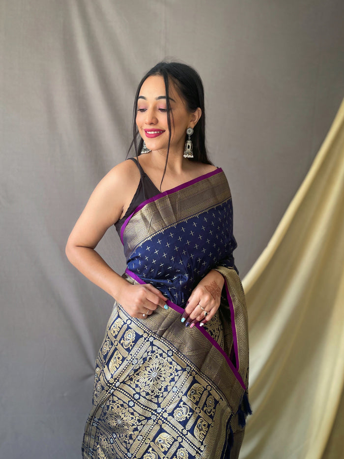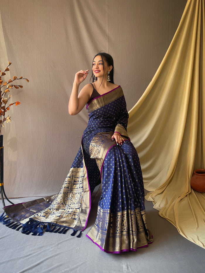 Beautiful Navy Color Soft Silk Saree with Silver & Gold Zari Checks, Gold Zari Woven Broad Border, Elegant Pallu | Unstitched Blouse Piece.