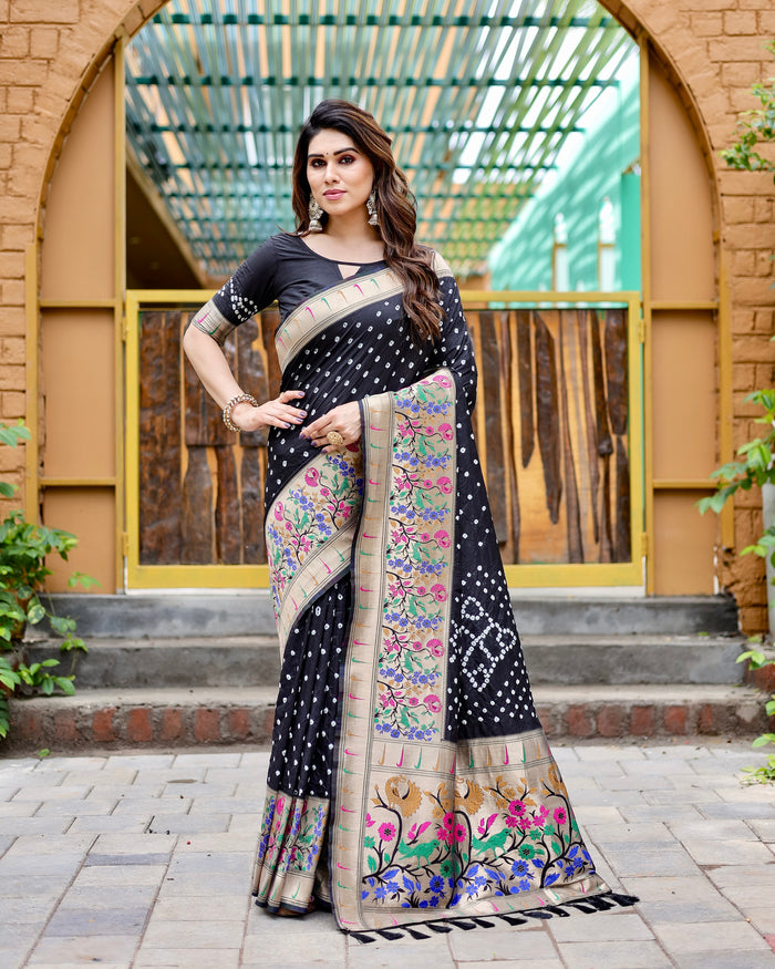 Elevate your wardrobe with our Premium Bandhej Paithani Silk Saree, a perfect blend of luxury and style. This high-quality saree features: