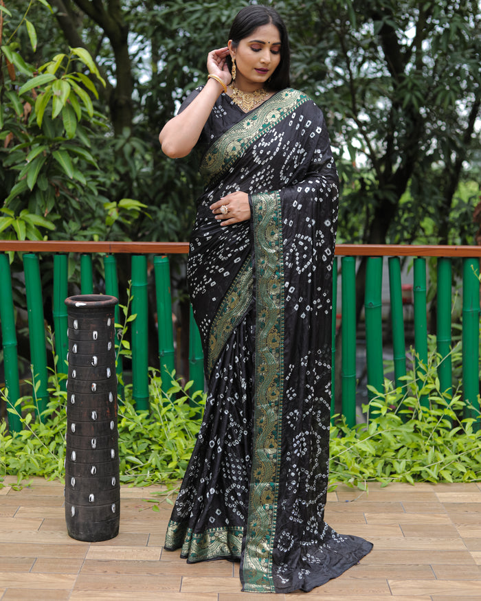 Enhance your collection with our Premium Bandhej Silk Saree, featuring a sophisticated dual color design and intricate zari weaving. This high-quality saree is crafted from soft, lightweight Bandhej silk, offering a luxurious and comfortable drape that's perfect for any occasion.