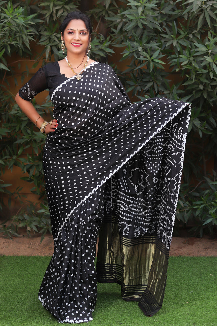 Introducing our Premium Pure Bandhej Silk Saree—a masterpiece of traditional craftsmanship and modern elegance. Crafted from high-quality Bandhej silk, this saree features exquisite Lagdi Patta zari weaving and a rich, ornate pallu, offering a blend of comfort and style.