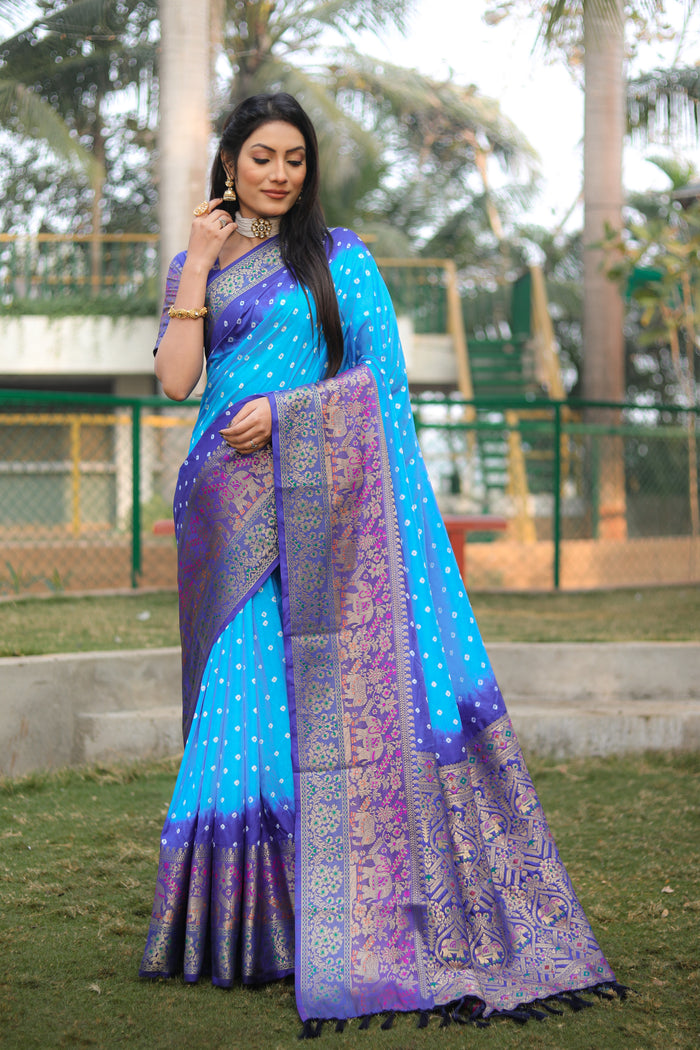 Blue Handmade Bandhej Kanjivaram Silk Saree With Bandhej Design