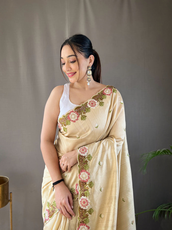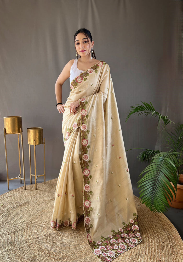 Discover the elegance of our Pure Tussar Silk Saree, featuring exquisite all-over contrast embroidery work that adds a touch of opulence and sophistication. The saree is adorned with intricate motifs throughout, enhancing its traditional charm. The cutwork border introduces a modern, detailed design, creating a stunning visual appeal. Paired with a full-work blouse, this ensemble offers a cohesive and elegant look, perfect for any special occasion.