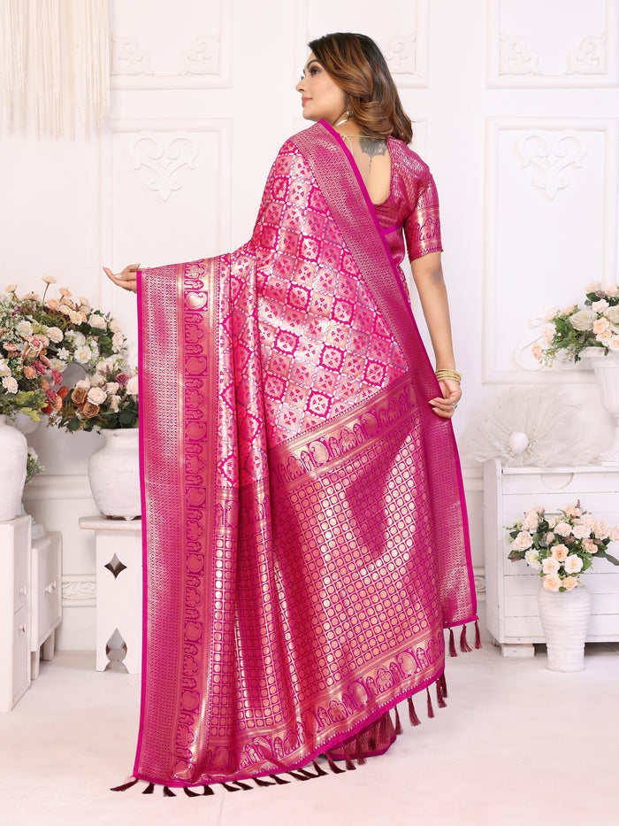 The Jari weaving border brings out a regal finish, while the rich woven pallu adds a touch of grandeur, making this saree a true statement piece. The saree is paired with a contrast blouse that features a woven border, complementing the overall look and elevating your style quotient.