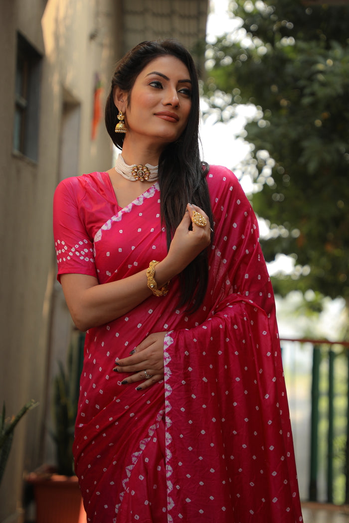 Experience timeless beauty and modern style with this premium Bandhej silk saree. Shop now to add a touch of sophistication to your collection!