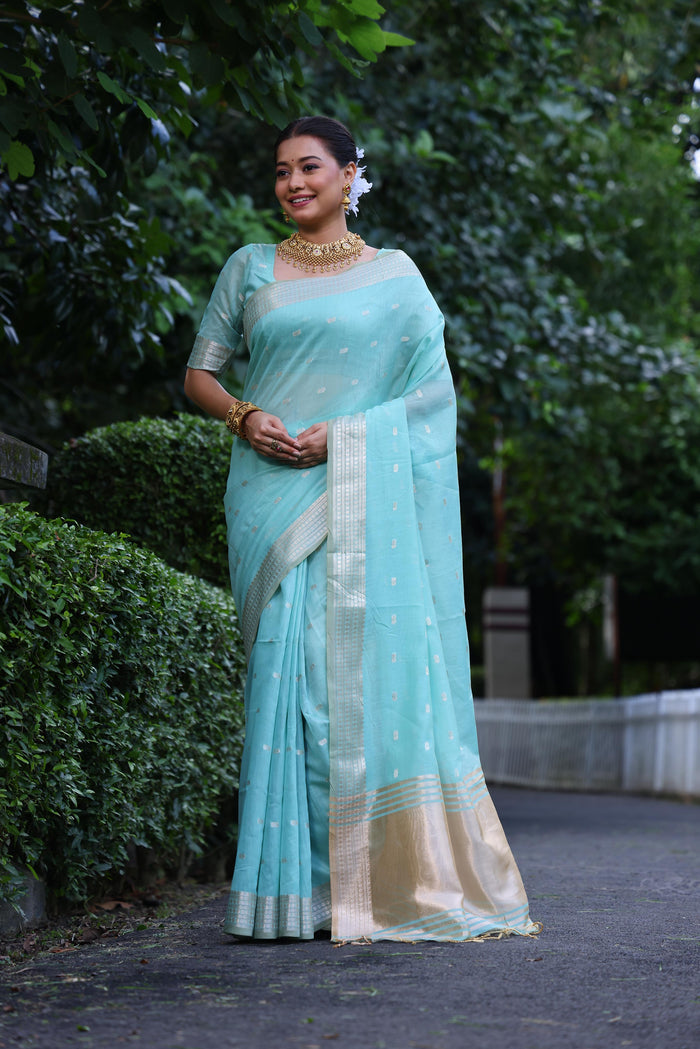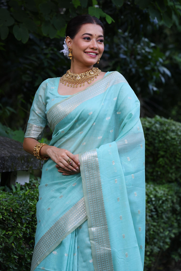 Firoz Color Maheshwari Tissue Silk Weaving Saree with Zari Butties, Woven Pallu, Border, and Fancy Tassels - Elegant Traditional Wear.