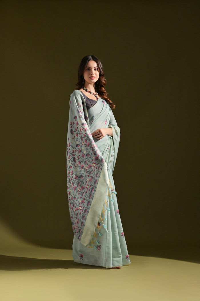 The classic colorful resham weaving pallu adds vibrancy and elegance, perfectly complementing the floral design on the body. The saree is finished with fancy tassels at the edges, offering a chic, contemporary twist to the traditional look. It also comes with a contrast blouse piece, allowing you to customize your look to suit your style.