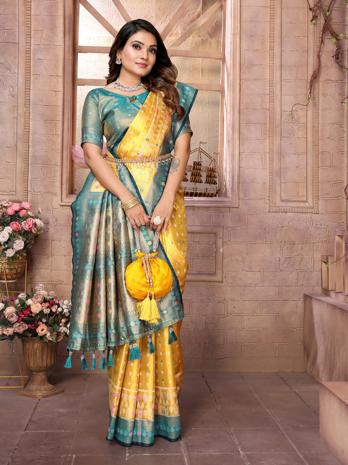 Buy Golden Patola Silk Sarees With Pure Banarasi Tissue Silk having superior quality. This is suitable for haldi function durring wedding time
