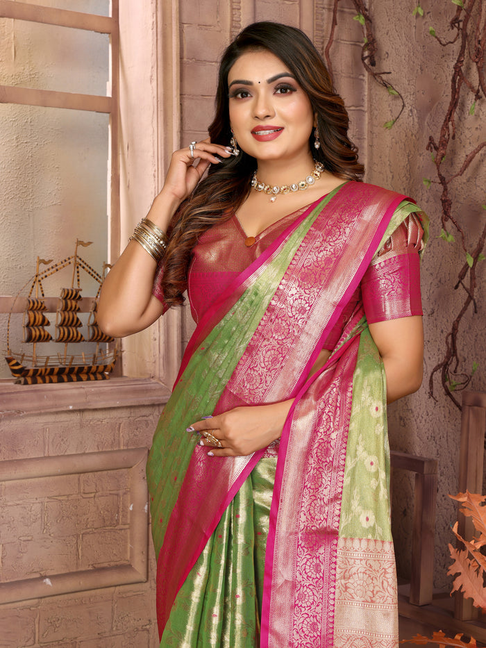Embrace the beauty of handloom with this stunning Tissue Silk Saree, ideal for those who love to combine traditional craftsmanship with modern trends.