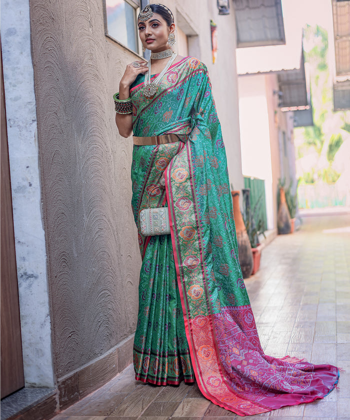 Elevate your ethnic wardrobe with our Elegant Patola Silk Saree, featuring exquisite Meenakari weaving throughout. This stunning saree boasts a luxurious rich pallu and a beautiful contrast brocade that adds a touch of opulence to your look. Perfect for special occasions and celebrations, this saree comes with a fancy unstitched blouse, allowing you to customize it to your style. Made from high-quality Patola silk, this saree offers a blend of traditional charm and modern elegance. Shop now to experience the timeless beauty of Patola silk sarees with intricate Meenakari patterns and a sophisticated design