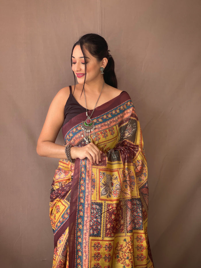 Experience the allure of traditional artistry with our soft cotton sarees featuring exquisite all-over Kalamkari prints. The intricate Kalamkari designs grace the entire fabric, offering a unique blend of craftsmanship and elegance. The saree is enhanced with a contrast printed pallu that adds a vibrant touch, complemented by stylish tassels for added sophistication.