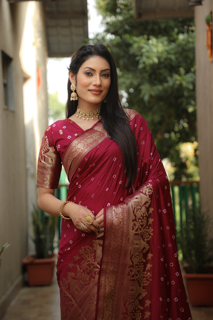 Maroon Color Handmade Bandhej Kanjivaram Silk Saree For Women