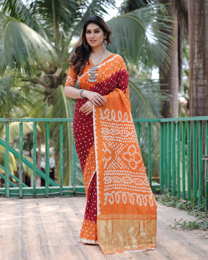 Elevate your wardrobe with our premium Pure Bandhej Silk Saree, a perfect blend of traditional elegance and contemporary style. Crafted from high-quality Bandhej silk, this saree showcases authentic Bandhej design, beautifully complemented by a Bandhej border with intricate Zari weaving. The rich tissue pallu adds a luxurious touch, making this saree an ideal choice for weddings, festive occasions, and special events. Soft, comfortable, and incredibly stylish, this saree ensures you make a statement wherever you go. The saree comes with an unstitched blouse piece, offering you the flexibility to tailor it to your desired fit.