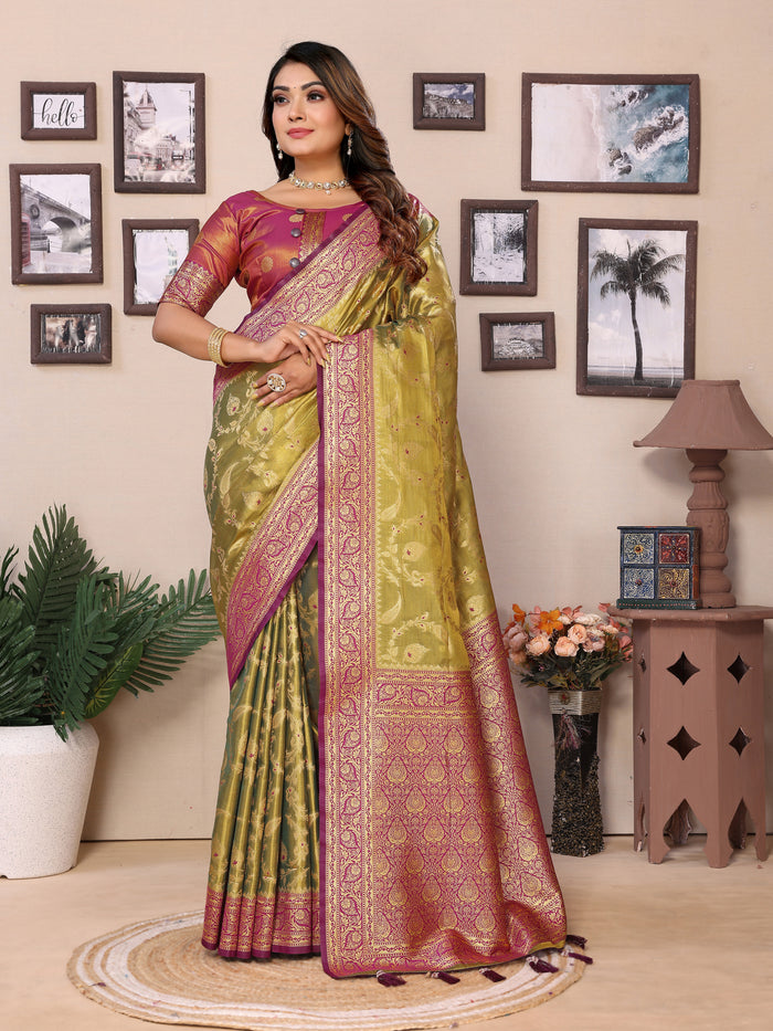 Crafted from pure tissue silk, this saree is soft, silky, and lightweight, offering a graceful drape that enhances your natural beauty. The saree comes with a contrast rich weaved blouse, perfectly complementing the saree for a complete look that’s both classic and contemporary.