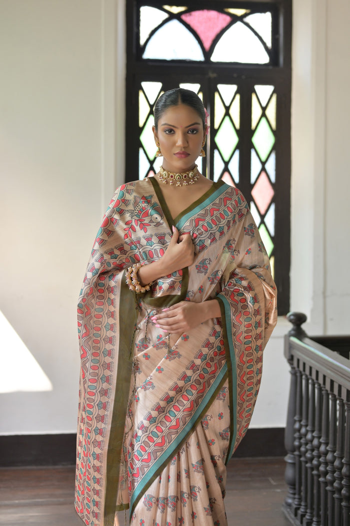 Make a stunning statement with this Soft Tussar Silk Saree featuring exquisite Madhubani prints. The saree showcases intricate, hand-painted Madhubani artwork that brings traditional artistry to life. Its traditional printed pallu adds a rich cultural touch, while the fancy tassels enhance the saree's elegant charm. Designed for those special occasions, this saree comes with a contrast blouse piece that perfectly complements the vibrant hues. Ideal for weddings, festivals, and cultural events, this designer Tussar silk saree ensures a blend of comfort, style, and tradition.