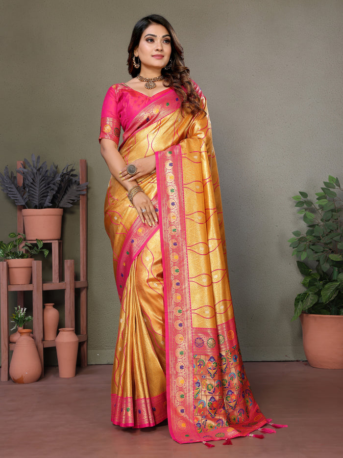This Banarasi tissue silk saree with Leheriya weaving and contrast Laheriya borders is a must-have for anyone seeking to add a touch of luxury and elegance to their wardrobe.