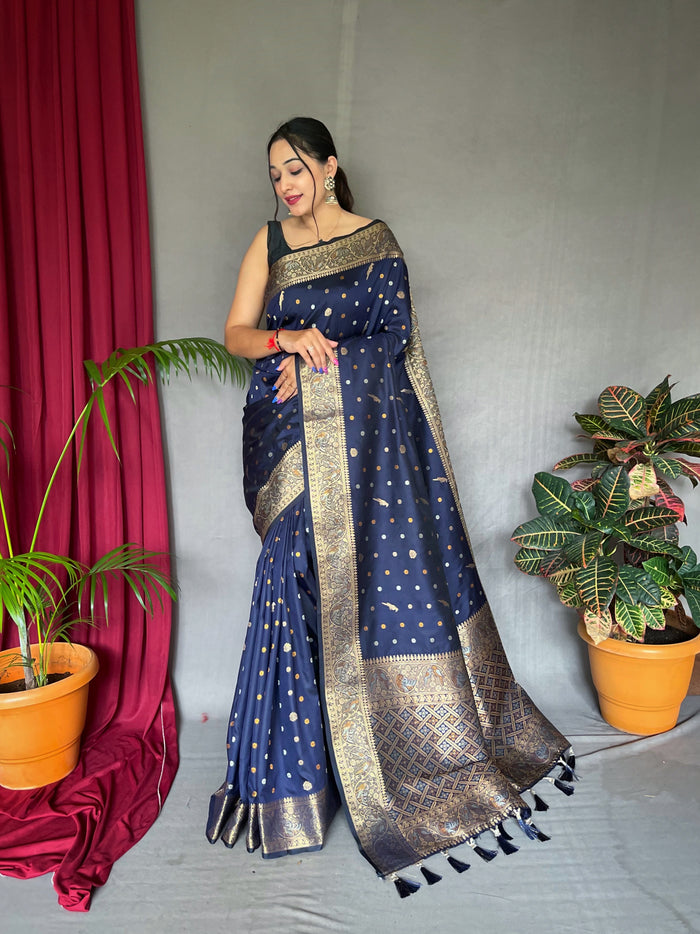 Navy Color Pure Soft Silk Saree with Copper & Golden Zari Woven Border, Rich Pallu with Beautiful Motifs & Elegant Color Combination | Three Zari Used, Unstitched Blouse Included.