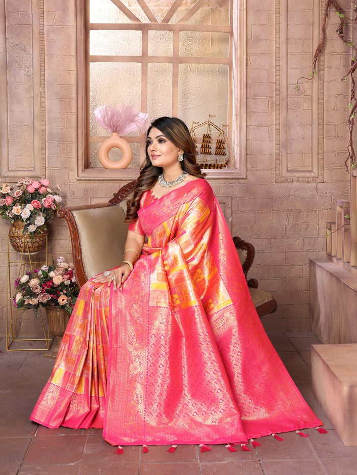 Crafted from premium Banarasi silk, this saree offers a soft, luxurious feel and drapes beautifully, enhancing your natural grace. It pairs perfectly with a contrast blouse with woven border, creating a complete, cohesive look that’s sure to make a lasting impression.