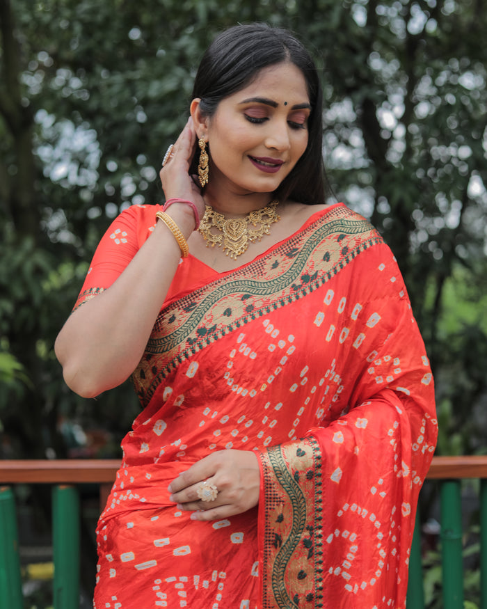 Ideal for weddings, festive celebrations, and special events, this saree combines classic beauty with contemporary style. Shop now to add this luxurious Bandhej silk saree to your wardrobe and make a statement at your next event!