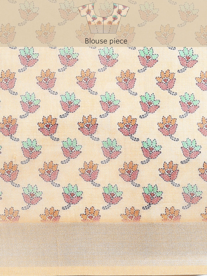 Add a touch of elegance to your wardrobe with this Soft Pure Linen Saree, designed to make you stand out on any special occasion. Featuring an all-over classic floral print, this saree offers a timeless, sophisticated look perfect for weddings, festivals, and parties. The Kantha printed lotus border adds a traditional charm, while the zari lining border enhances its opulence, giving it a regal appeal. The classic pallu further elevates the saree with its graceful design, making it an ideal choice for those looking for a blend of tradition and modernity. Crafted from high-quality pure linen fabric, this saree ensures comfort and durability. The saree comes with a running blouse piece, allowing for a customized fit.