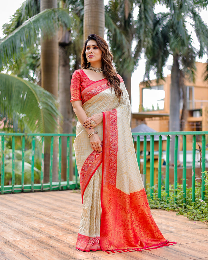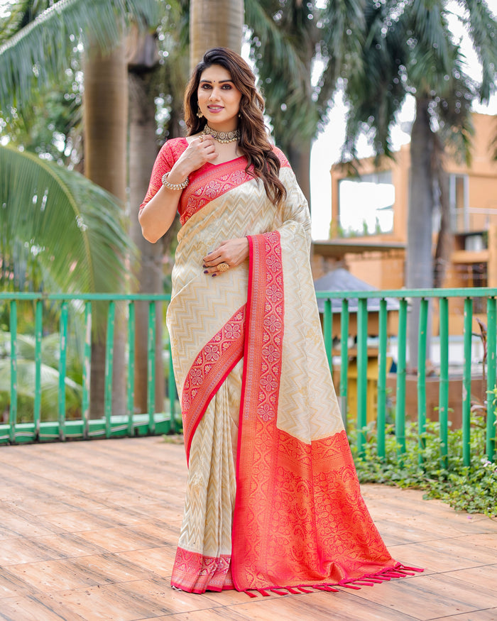 • Three Types of Zari Weaving: Includes three types of zari weaving – embossed and traditional, adding depth and sophistication to the saree.