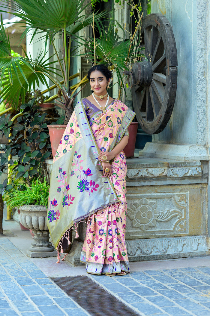 Experience the elegance of tradition with this Soft Banarasi Silk Paithani Saree, a masterpiece woven with an exquisite floral zari and meena weaving pattern. The intricate weaving is complemented by a contrast weaving border, adding a vibrant and modern touch to this timeless piece. The saree features a rich pallu, adorned with luxurious tassels, enhancing its regal appeal. This saree also comes with a contrast blouse piece, giving you the freedom to create a customized look that perfectly complements the saree.