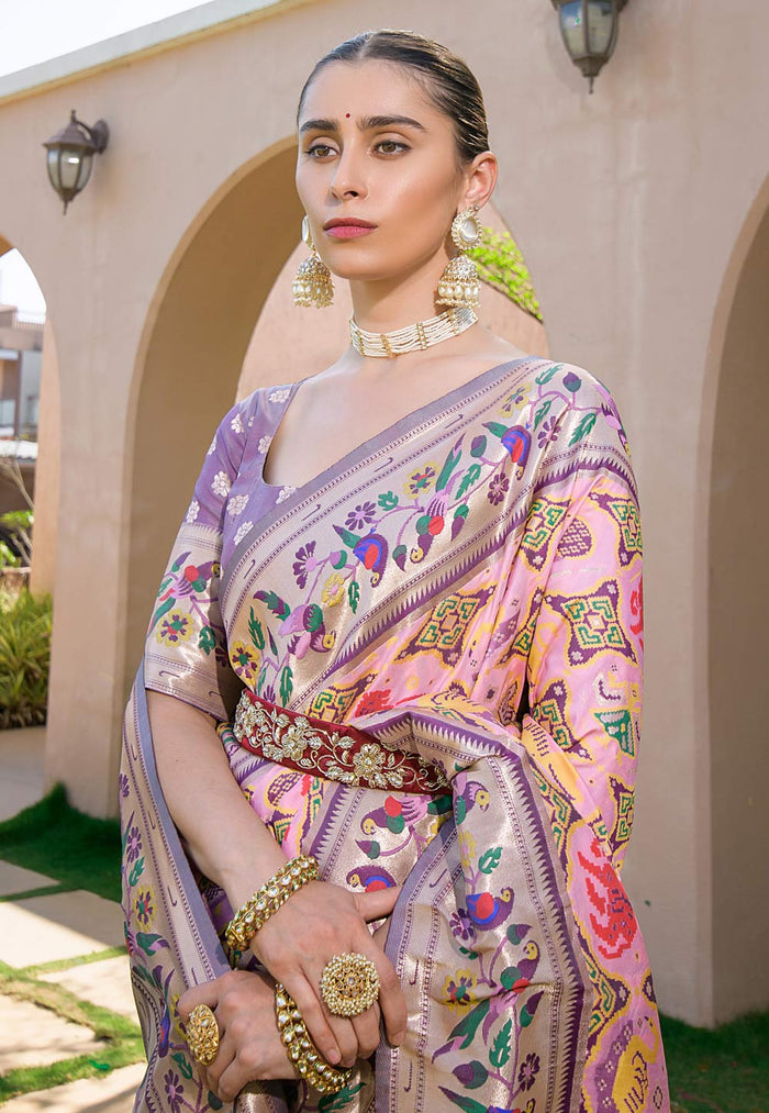 Elevate your ethnic wardrobe with our exquisite Banarasi Soft Silk Paithani Patola Saree. This stunning saree features intricate all-over meena and zari weaving, showcasing the artistry of traditional Indian craftsmanship. The Paithani-inspired border adds a touch of elegance, while the exclusive rich pallu enhances its regal charm.
