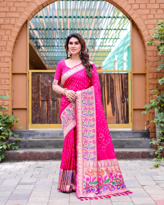 Pink Bandhej Paithani Silk Saree and Matching Blouse