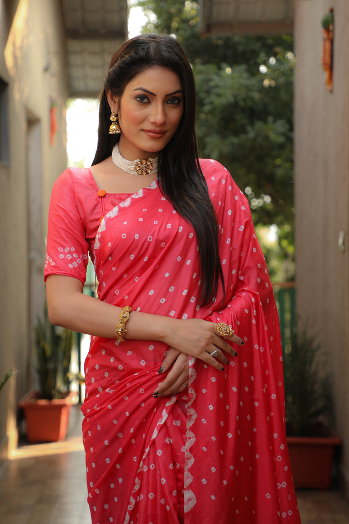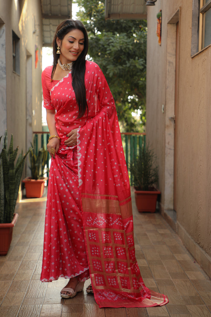 Experience timeless beauty and modern style with this premium Bandhej silk saree. Shop now to add a touch of sophistication to your collection!