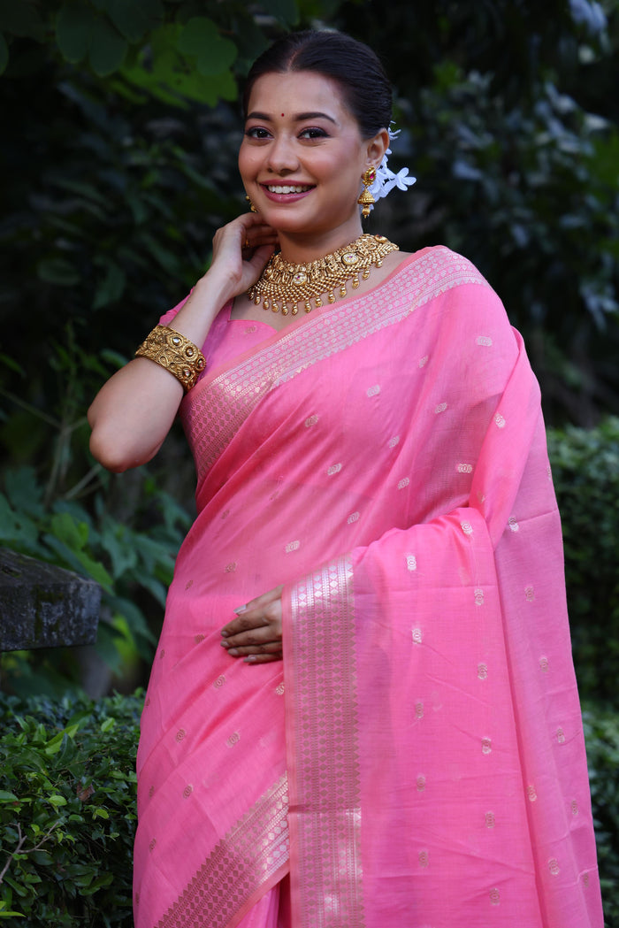 Discover the perfect blend of tradition and luxury with this Maheshwari Tissue Silk Weaving Saree. Crafted with care and expertise, this saree features zari woven butties all over, adding a touch of opulence and grace to your ensemble. The zari woven pallu and border further elevate the saree’s elegance, ensuring a regal and refined look for any special occasion. The saree is completed with fancy tassels at the end of the pallu, giving it a modern twist while preserving its traditional charm.