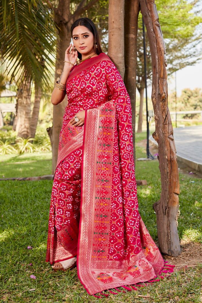 Elevate your wardrobe with our Premium Gharchola Bandhej Silk Sarees, crafted to offer unparalleled style and comfort. These high-quality Bandhej silk drapes are designed to make a statement with their stunning Bandhej design and intricate Minakari Jari weaving.