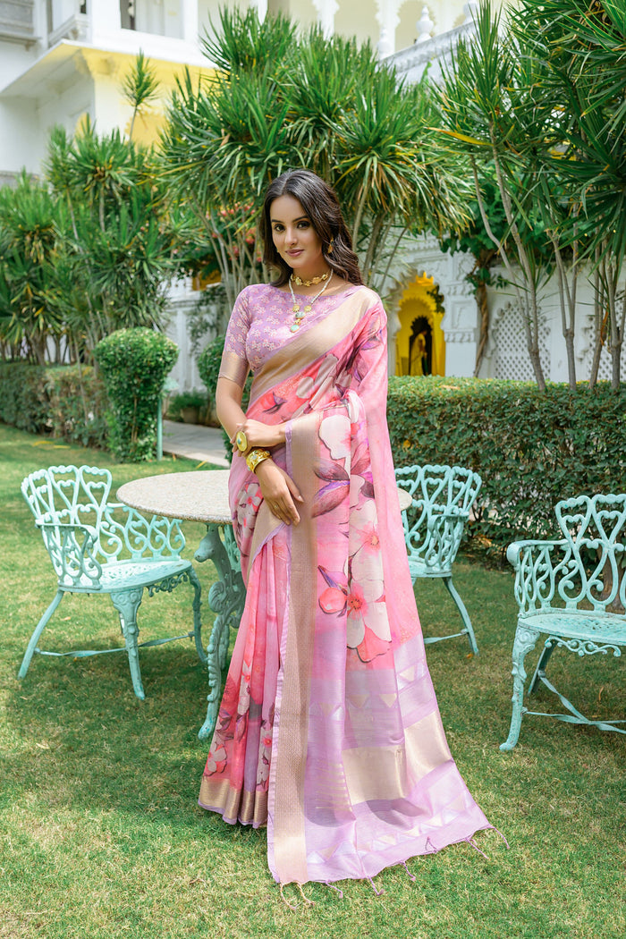 Buy Pink Linen sarees online in India a available in soft cotton. Our Pink linen sarees have Floral printed and weaving border