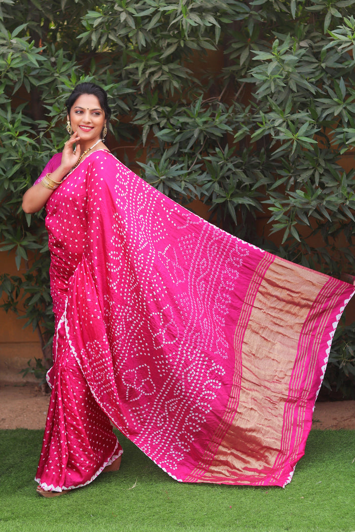 Introducing our Premium Pure Bandhej Silk Saree—a masterpiece of traditional craftsmanship and modern elegance. Crafted from high-quality Bandhej silk, this saree features exquisite Lagdi Patta zari weaving and a rich, ornate pallu, offering a blend of comfort and style.