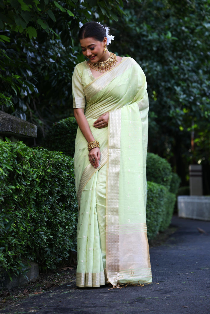 Pista Color Maheshwari Tissue Silk Weaving Saree with Zari Butties, Woven Pallu, Border, and Fancy Tassels - Elegant Traditional Wear.