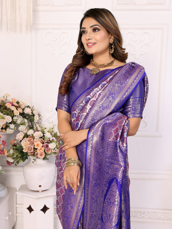 The Chaturi Banarasi silk saree is designed to shine with its sheer fabric that offers a graceful flow and stunning drape. The saree comes with a contrast blouse featuring a woven border, making it an ideal pairing to complete your traditional ensemble.