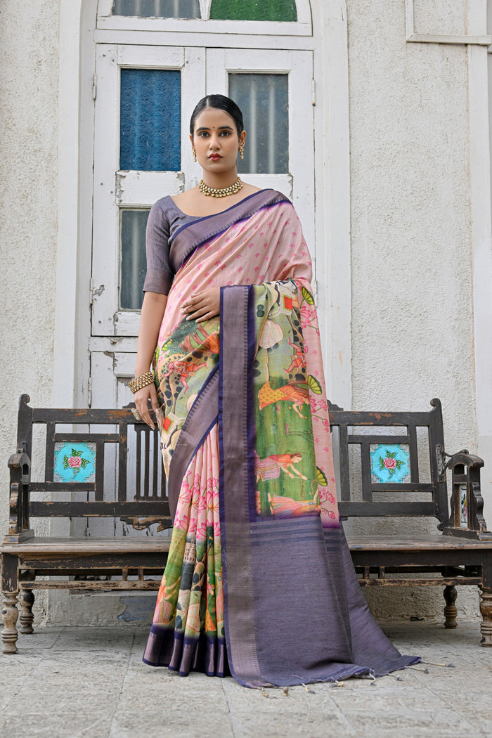 Whether you are attending a cultural event or a grand celebration, this Bhagalpuri silk saree with Pichwai print, contrast border, and classic tassels will make you stand out in every crowd.