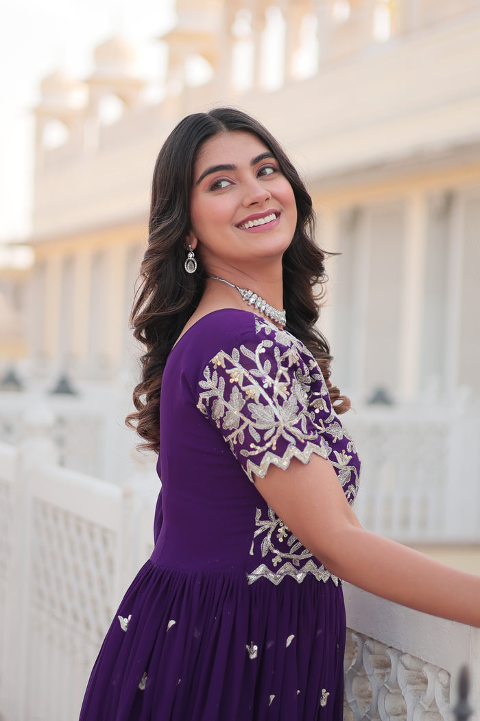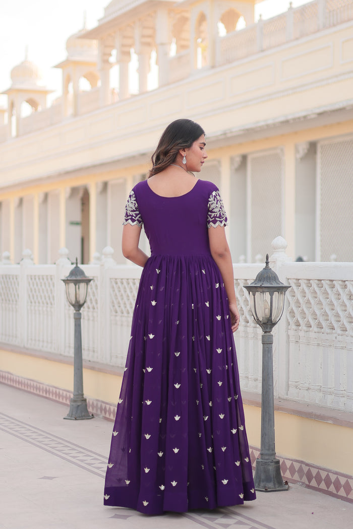 Discover the latest in high-fashion with our Trendsetting Gown, crafted from luxurious Faux Blooming Fabric and adorned with intricate Coding Sequins Embroidery. This gown epitomizes modern elegance, making it an aspirational choice for women who seek to wear the best in designer fashion.