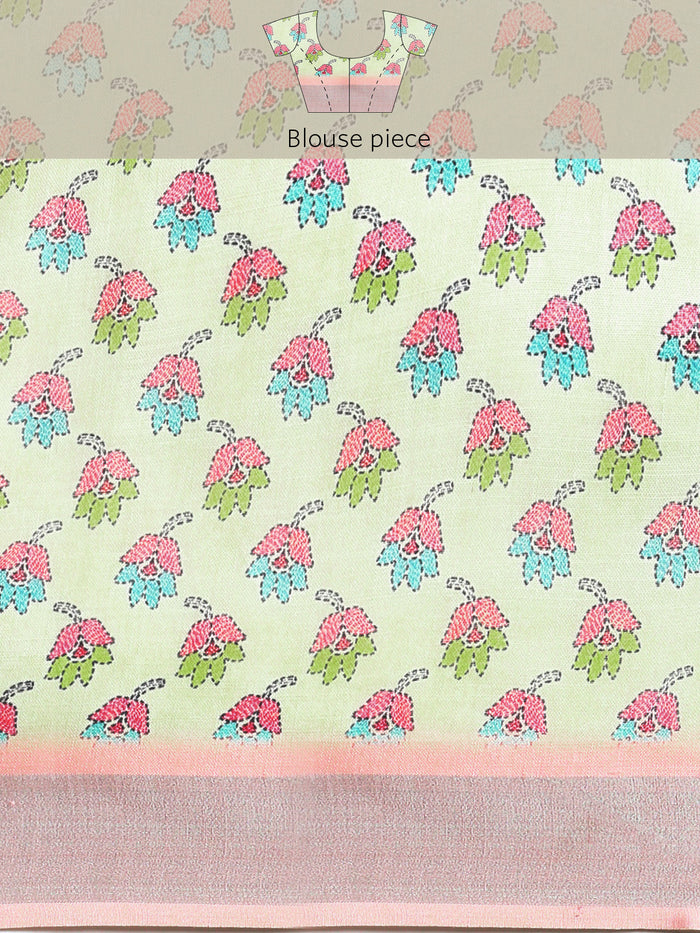 Add a touch of elegance to your wardrobe with this Soft Pure Linen Saree, designed to make you stand out on any special occasion. Featuring an all-over classic floral print, this saree offers a timeless, sophisticated look perfect for weddings, festivals, and parties. The Kantha printed lotus border adds a traditional charm, while the zari lining border enhances its opulence, giving it a regal appeal. The classic pallu further elevates the saree with its graceful design, making it an ideal choice for those looking for a blend of tradition and modernity. Crafted from high-quality pure linen fabric, this saree ensures comfort and durability. The saree comes with a running blouse piece, allowing for a customized fit.
