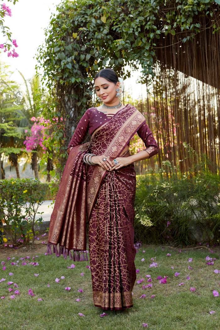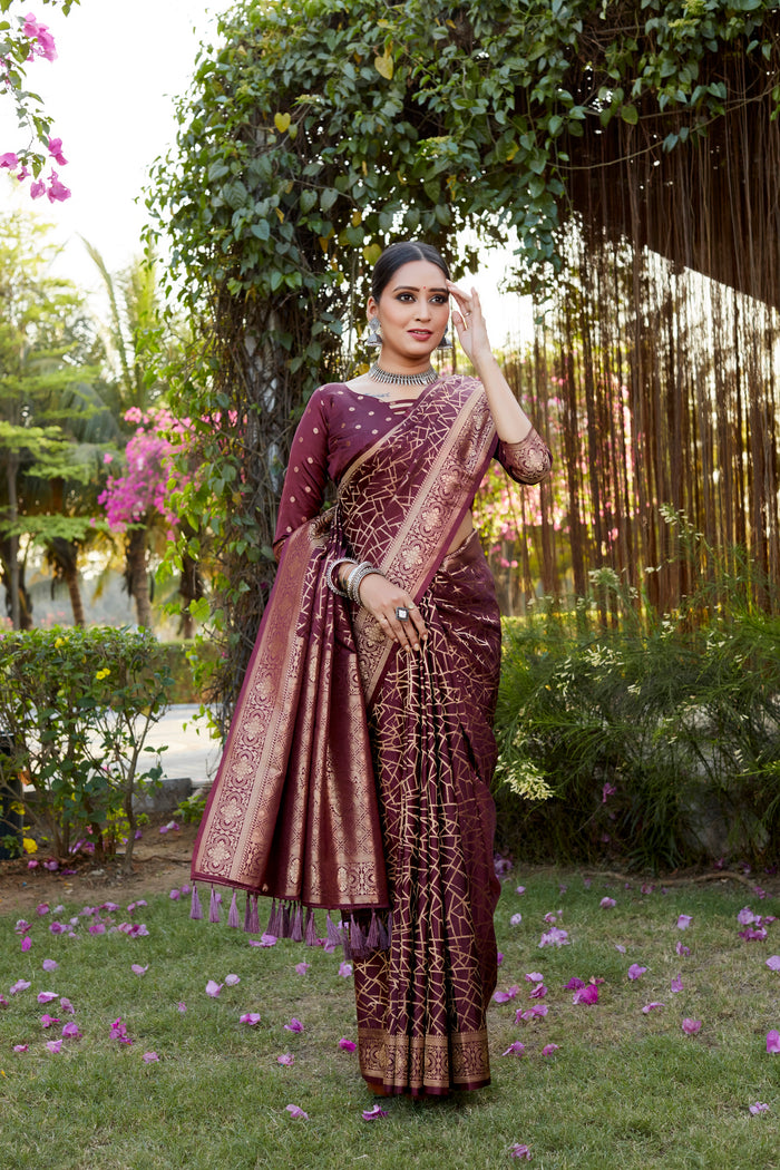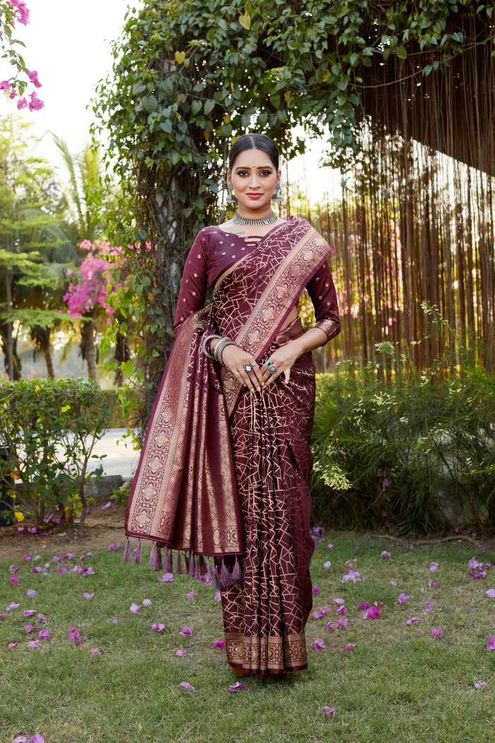 Buy Red and Gold Kanjivaram Saree in Soft Satin Silk having designer border. Comes along unsitched Blouse piece in Dark red color