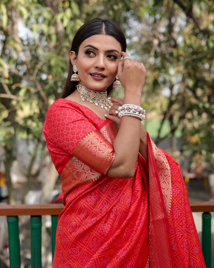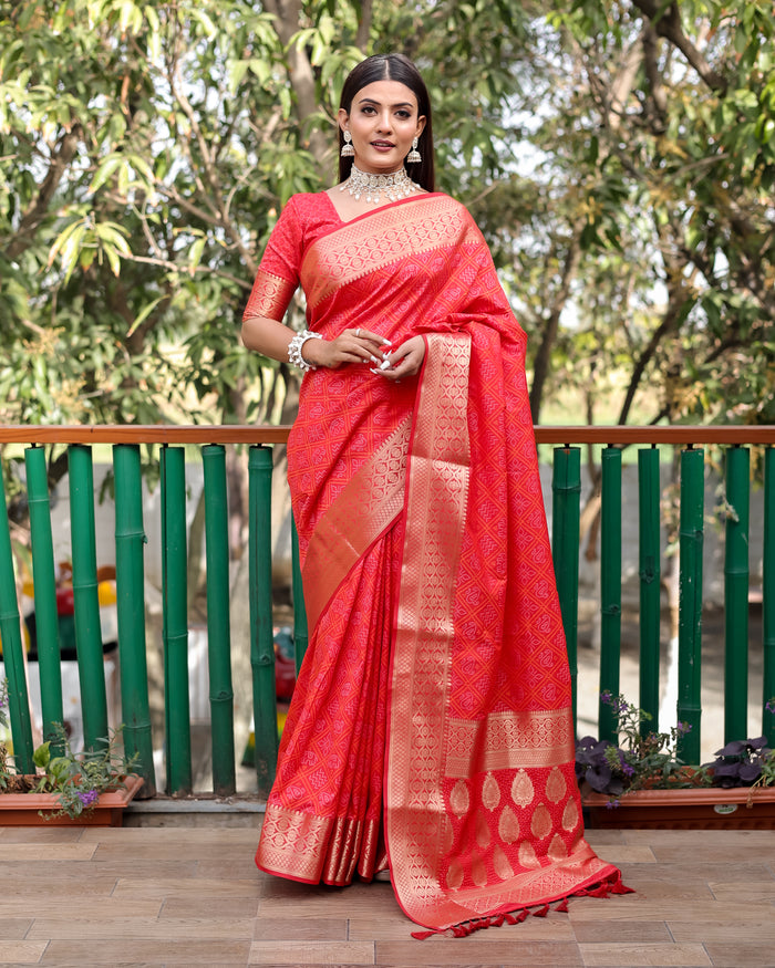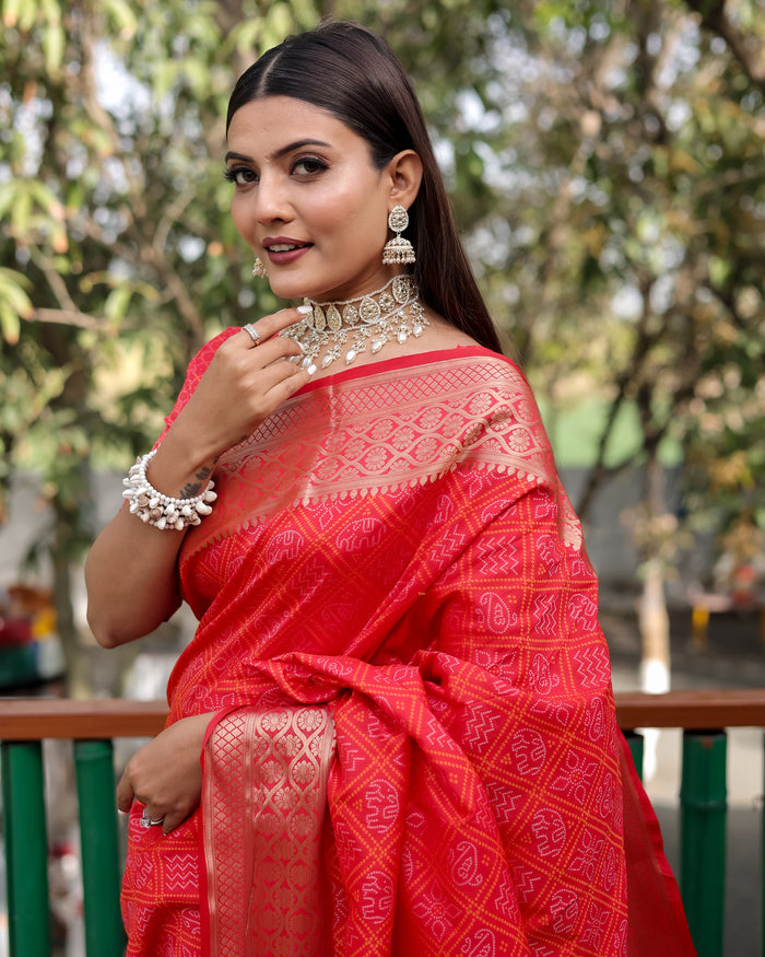 • Bandhej Patola Weaving: Intricate all-over Bandhej design combined with Zari Patola weaving for a rich, traditional look.