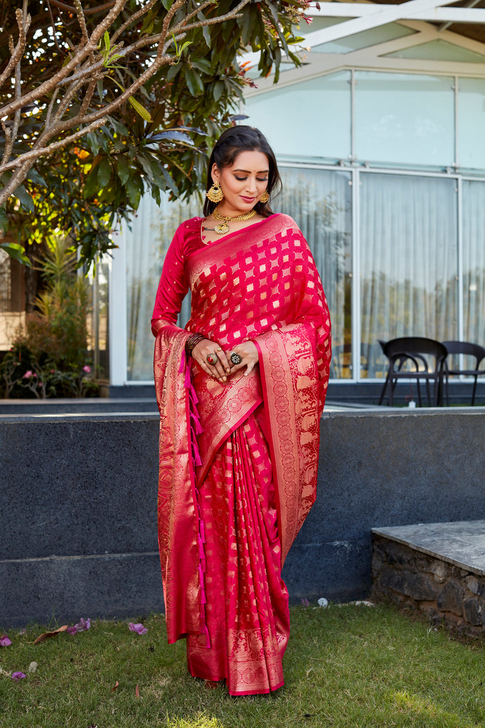 Buy Red Satin Sarees in silk online in India a available.our Red Satin Sarees with Woven border