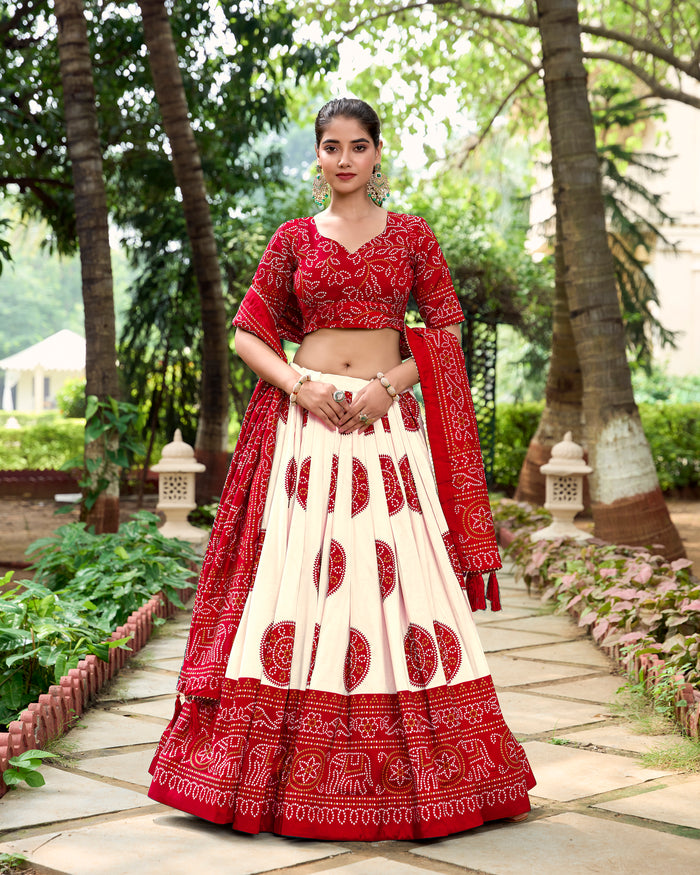 Step into timeless elegance with this beautifully crafted Bandhej Printed Lehenga Choli Set. Made from rich Tussar Silk fabric, this ethnic ensemble is a celebration of traditional Indian craftsmanship and modern style. Perfect for festive occasions, weddings, sangeet, and cultural celebrations, this set promises comfort, style, and vibrant charm.