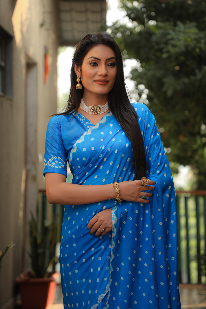 Sky Blue Bandhej Silk Saree with Checks Pattern Pallu