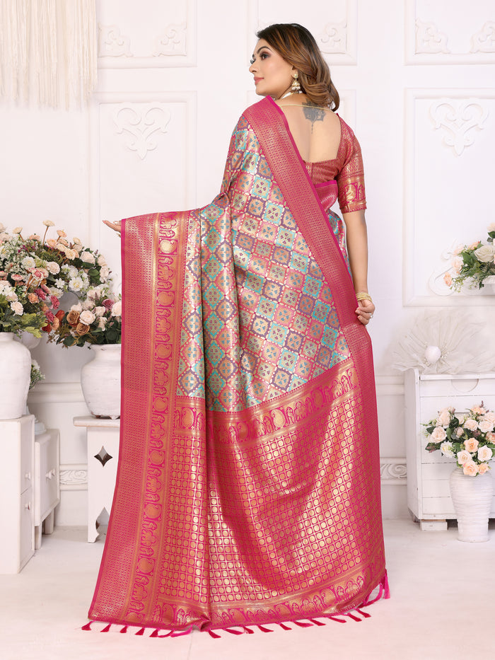 The Jari weaving border brings out a regal finish, while the rich woven pallu adds a touch of grandeur, making this saree a true statement piece. The saree is paired with a contrast blouse that features a woven border, complementing the overall look and elevating your style quotient.