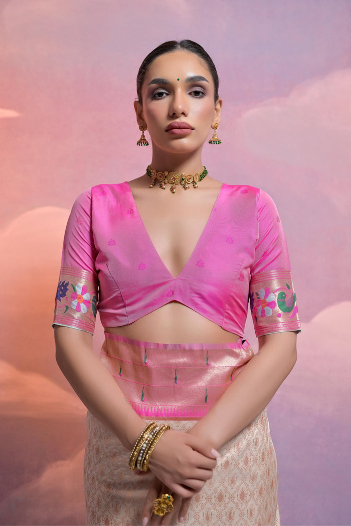 White Soft Banarasi Silk Saree Paithani with Kanjivaram Weaving