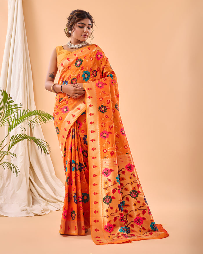 Elevate your elegance with our Pure Paithani Silk Saree, featuring a stunning jaal design all over, intricately adorned with meenakari work. This exquisite saree boasts Paithani borders on both sides, enhancing its traditional charm. The richly designed pallu adds a touch of opulence, making it perfect for weddings, festivals, and special occasions. Includes an unstitched blouse piece for a custom fit.